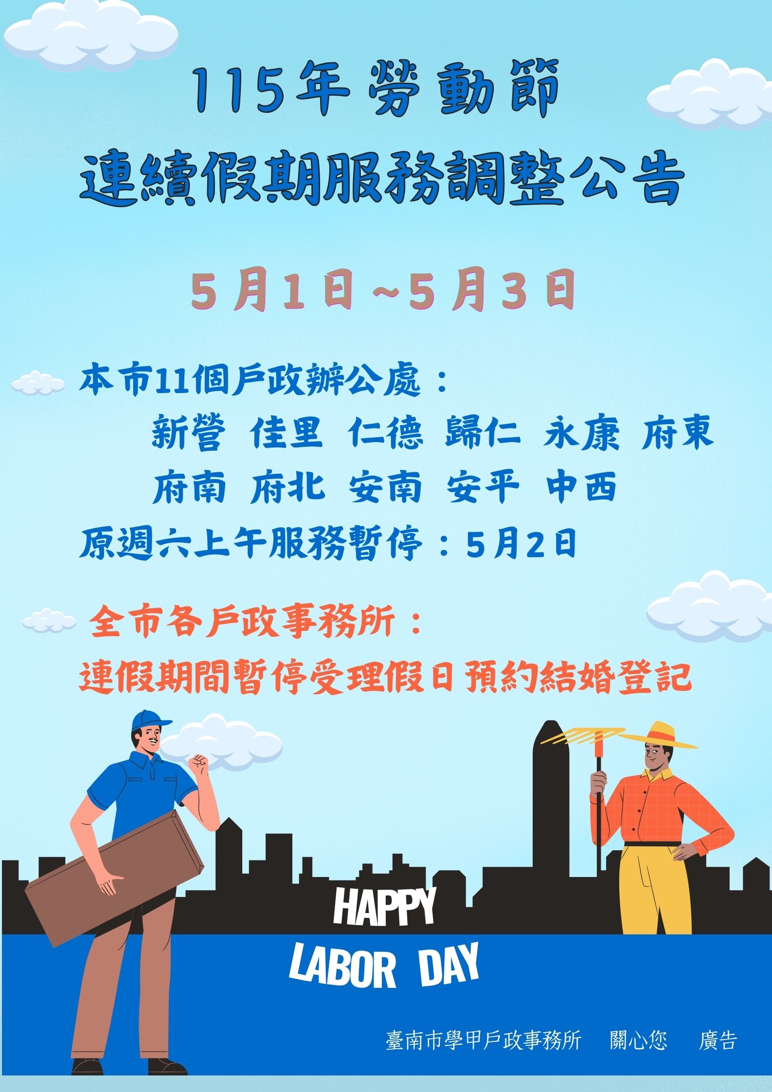 一、因應勞動節連續假期(115年5月1日至5月3日),本市新營、佳里、仁德、歸仁、永康、府東、府南、府北、安南、安平及中西等11個戶政辦公處,原週六(5月2日)上午延長服務暫停一次,各戶政事務所於連假期間暫停受理假日預約結婚登記。 二、另衡酌勞動節前一日4月30日(星期四)適逢月底最後一日,配合全 ...更多