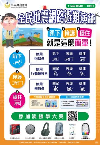 當國家防災日地震警報響起時,記得 #趴下、#掩護、#穩住!只要在114年9月1日至10月31日期間,以「個人/家庭」身份上傳照片到#消防防災館,就有機會抽中任天堂switch 2、irobot 掃地機器人等超讚獎品 快一起來演練吧!!