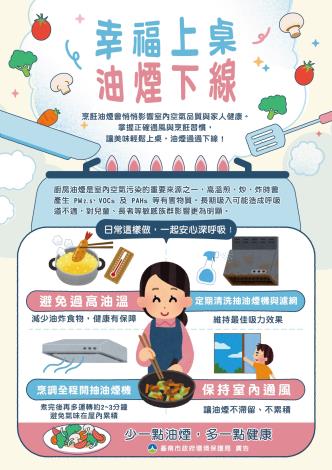 幸福上桌,油煙下線!廚房高溫煎、炒、炸時產生之油煙是室內空氣污染物質來源之一,長期吸入可能造成呼吸道不適;臺南市環保局提醒市民朋友,烹飪請開抽油煙機並保持室內通風,減少油煙,守護居家空氣品質與家人健康。