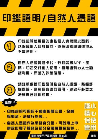 一、印鑑證明使用目的應依個人實際需求登載,以保障個人自身權益,避免印鑑證明遭他人不當使用。二、自然人憑證實體卡片、行動裝置app、密碼,切勿交付他人使用,慎防遭有心人士勸誘利用,而落入詐騙陷阱。三、請謹慎保管印鑑證明及自然人憑證,防範詐騙風險,避免個資遭到冒用,導致不必要之法律責任及個財損。四、印鑑證明可用於不動產相關交易、金融與繼承、法律行為等...五、自然人憑證作為網路身分證,可於線上申辦政府電子服務及部分金融機構業務等...