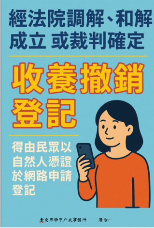 「經法院調解、和解成立或裁判確定之收養撤銷登記」,得由民眾以自然人憑證於網路申請登記。